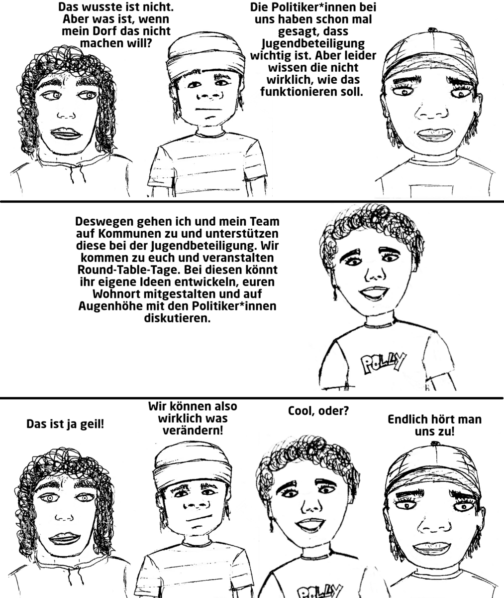 Du hast Lust in deiner Stadt etwas zu verändern und möchtest deine Ideen mit einbringen? Du hast das Gefühl, dass sich Erwachsene nicht für deine Meinung interessieren? Du bist in einem Jugendgremium aktiv und möchtest eine Beteiligungsveranstaltung mit Politiker*innen und vielen Jugendlichen organisieren? Dann können wir dich mit „POLLY“ unterstützen. Gemeinsam treten wir mit lokalen Politiker*innen und anderen Entscheidungsträger*innen in Dialog und ermuntern sie zum Durchführen der Round-Table-Tage.
